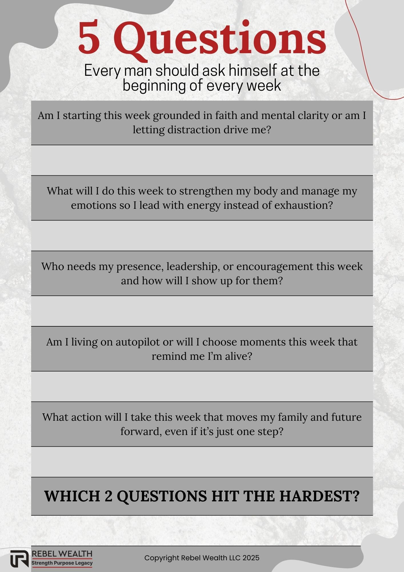 Your week will either own you, or you’ll own it. These five questions are designed to reset your focus, realign your priorities, and make sure you’re living with intention, not simply drifting through routine. Use them every Monday morning to lead your week with clarity, conviction, and unstoppable momentum.