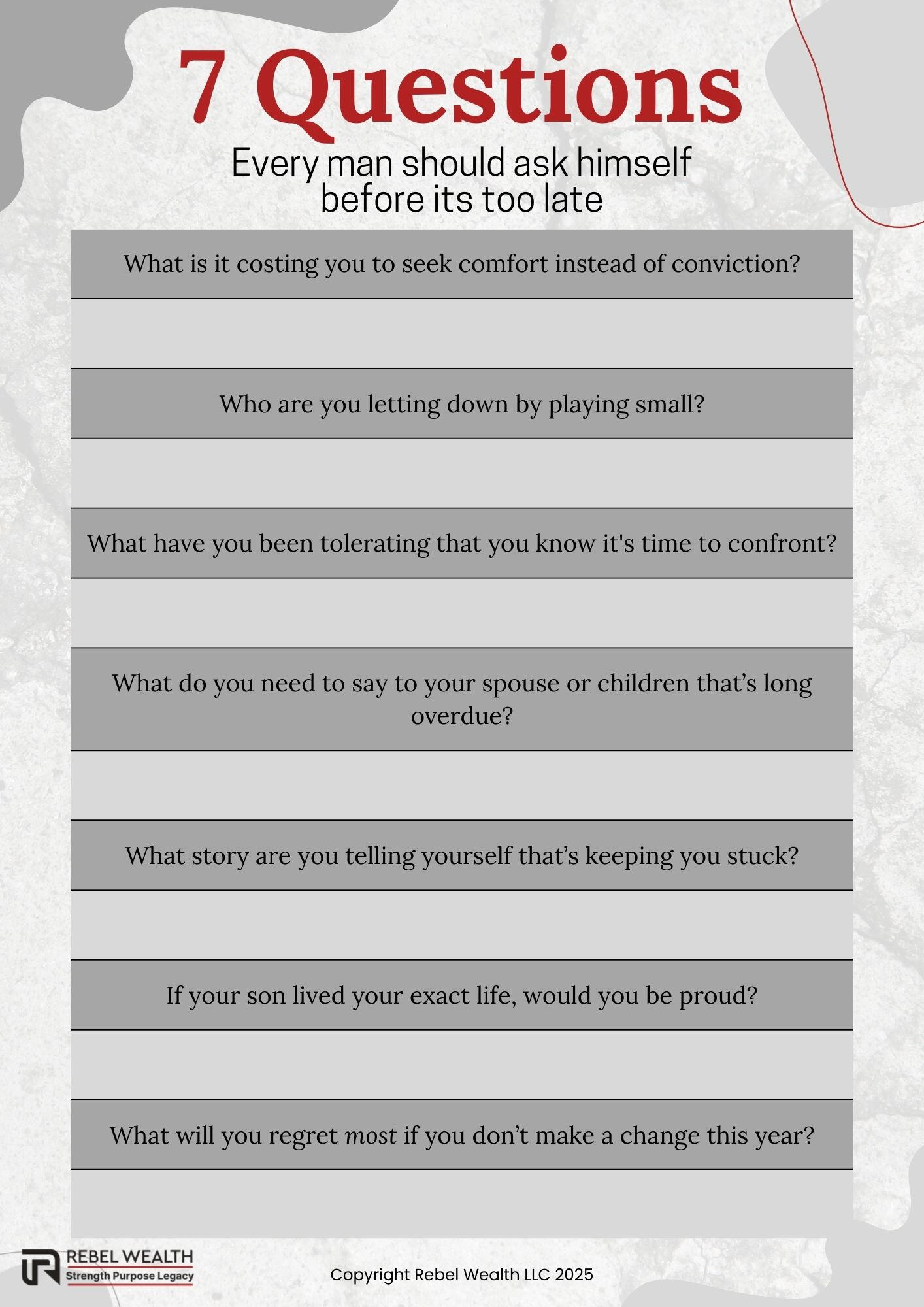 Most men wait until crisis hits to start asking the hard questions. Don’t.This gut-check cuts through the noise and forces you to face the truth about who you are, where you’re headed, and what will be left behind when you’re gone. Answer honestly, and you’ll discover the hidden gaps keeping you from living with strength, purpose, and legacy.