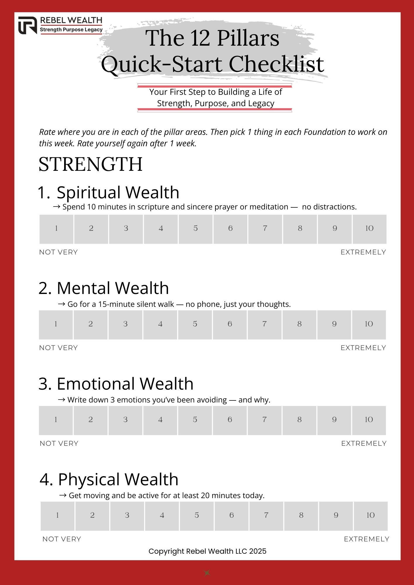Before you can build, you need to know your foundation. The 12 Pillars Self-Assessment is a simple but eye-opening tool that helps you measure where you stand today in the foundations of Strength, Purpose, and Legacy.Most men drift through life without clarity. They don’t see the cracks in their foundation until it’s too late. This assessment changes that. In just a few minutes, you’ll uncover:Where you’re strong.Where you’re struggling.When you know the truth about where you are, you gain the power to build where it matters most.