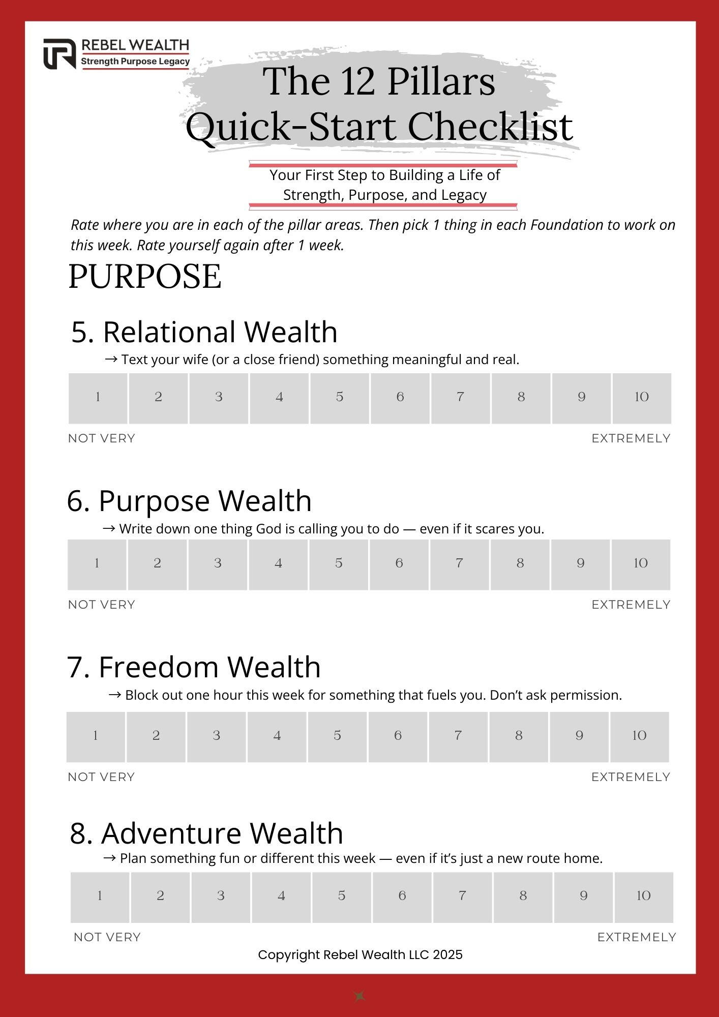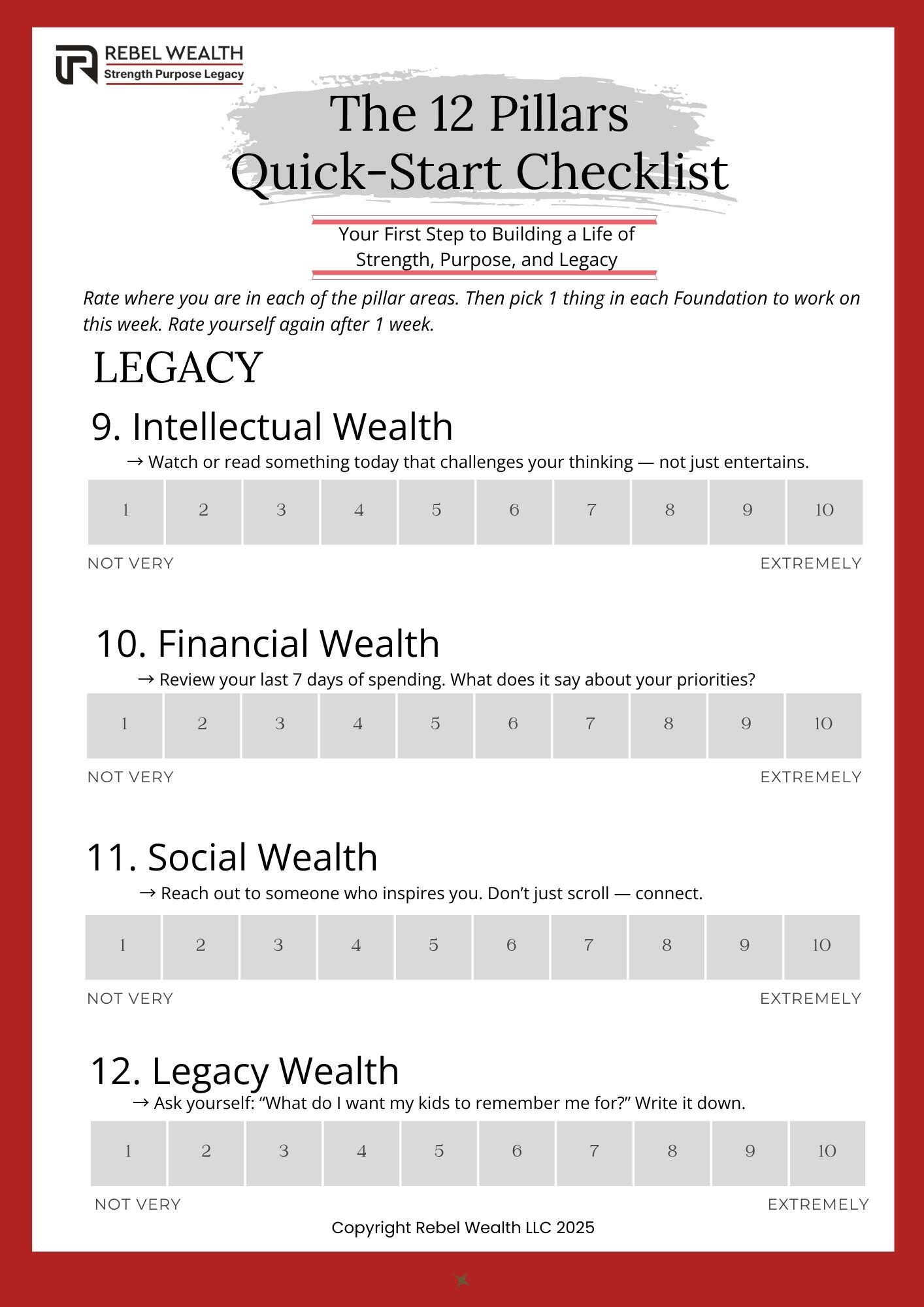 Before you can build, you need to know your foundation. The 12 Pillars Self-Assessment is a simple but eye-opening tool that helps you measure where you stand today in the foundations of Strength, Purpose, and Legacy.Most men drift through life without clarity. They don’t see the cracks in their foundation until it’s too late. This assessment changes that. In just a few minutes, you’ll uncover:Where you’re strong.Where you’re struggling.When you know the truth about where you are, you gain the power to build where it matters most.